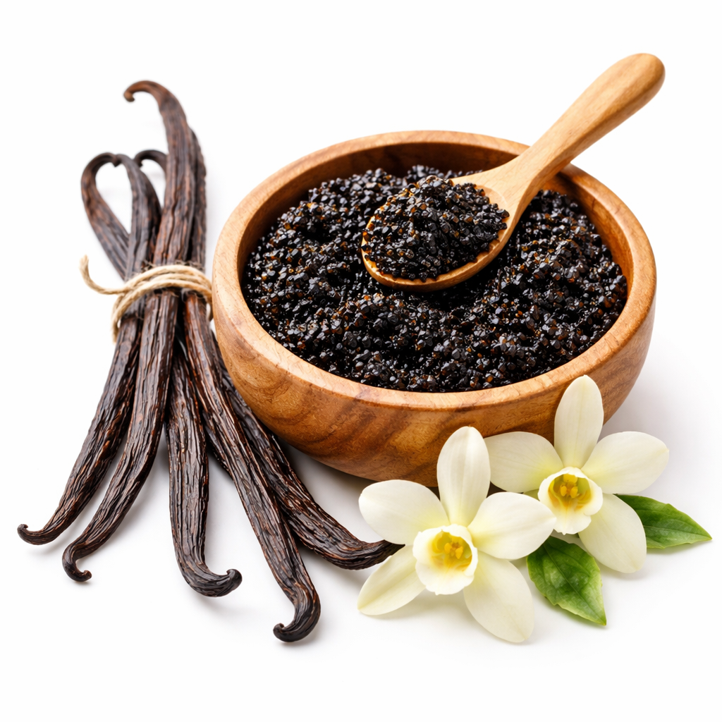 Vanilla caviar is the collection of tiny, dark seeds scraped from the inside of a vanilla bean pod. Sourced from the finest vanilla beans, our caviar is the precious, concentrated core of the vanilla pod, renowned for its intense flavor and captivating aroma.